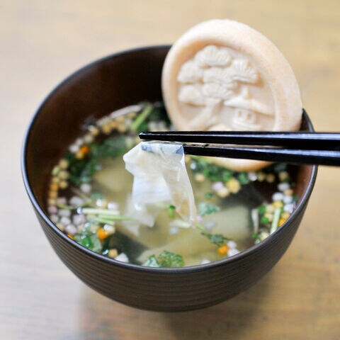 【原材料】<あさり>粉末だし(国内製造(食塩、砂糖、かつお節エキスパウダー、その他))、最中種(もち米)、乾燥あさり(あさり、還元水飴、食塩)、あられ(もち米、青のり、水飴)、わかめ、みつ葉/調味料(アミノ酸等)、環状オリゴ糖、着色料(コチニール、アナトー)、酸化防止剤(ビタミンE、ローズマリー抽出物)、(一部に小麦・大豆を含む)