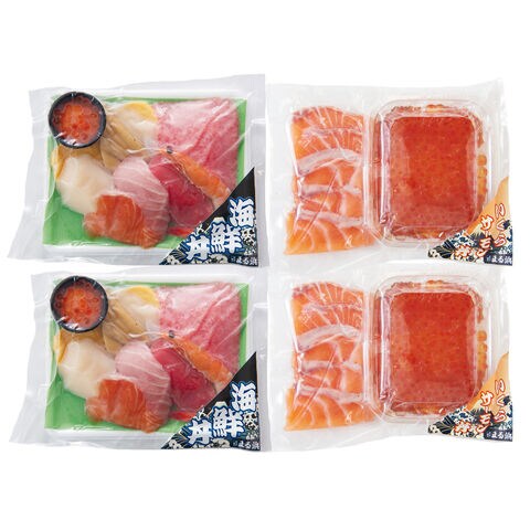 【数量・内容】10種海鮮丼の具150g、いくらサーモン丼の具(いくら70g、サーモン60g) 各2