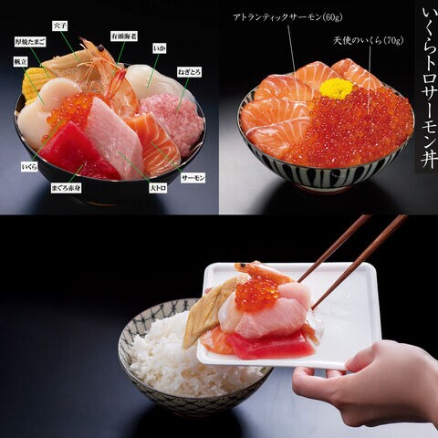 <10種の魚介が入った海鮮丼>大とろ、赤身、サーモン、いくら、いか、帆立、有頭海老、穴子、ねぎとろ、厚焼きたまごが入った海鮮丼のセット。