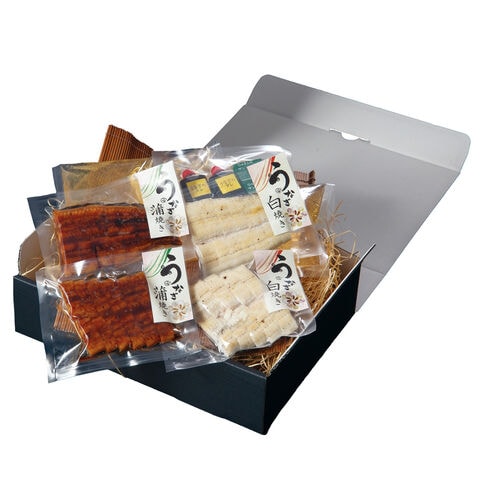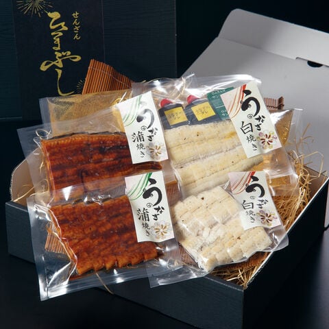 【数量・内容】うなぎ蒲焼50g×2、うなぎ白焼50g×2、ひつまぶし出汁150cc×4、うなぎのタレ10g×2、山椒0.2g×4、きざみのり0.3g×4、山葵2.5g×4