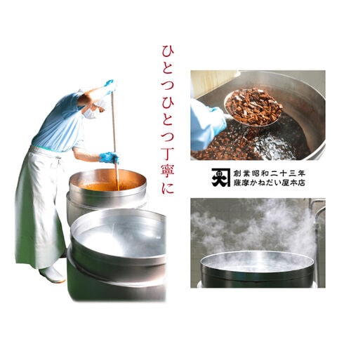 鹿児島県枕崎産のかつおを使用した「薩摩かねだい屋本店 かつお角煮」です。枕崎港で水揚げされたかつおを、丹精込めて佃煮に仕上げました。昭和23年の創業当初から変わらない製法で造り続けている、薩摩かねだい屋本店で人気を集める逸品です。味付けに使用する原料は、水飴、砂糖、醤油、みりん、生姜、寒天のみ。余分な添加物は使用していません。ご飯のおとも、おつまみ、酒の肴、お弁当の一品などとして、鹿児島産かつおの旨みがたっぷり詰まったおいしい佃煮をお取り寄せでお楽しみください。