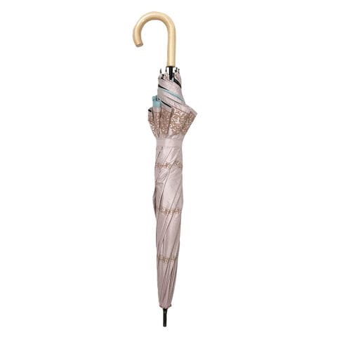 「トランスフォーム傘 晴雨兼用 熱中症対策 レース」は傘の老舗メーカー”スギタ(SUGITA)”が開発した傘です。長傘は持ち運びに邪魔、折りたたみ傘は畳むのが面倒な上、差したときに小さくて濡れる、といったお悩み、不便さを解消しました。畳むと子供傘サイズになり、持ち運びに便利。床に擦れることもありません。閉じた状態では親骨45cmですが、広げると親骨60cmの大きい傘に変身。本体生地はUVカット99.9%、遮光99.99%、遮熱約20℃、耐水圧10000mmのスペックを誇り、雨や日差しから体をガードできます。風や熱が抜ける構造で、耐風性に優れている上、熱中症対策にも役立ちます。