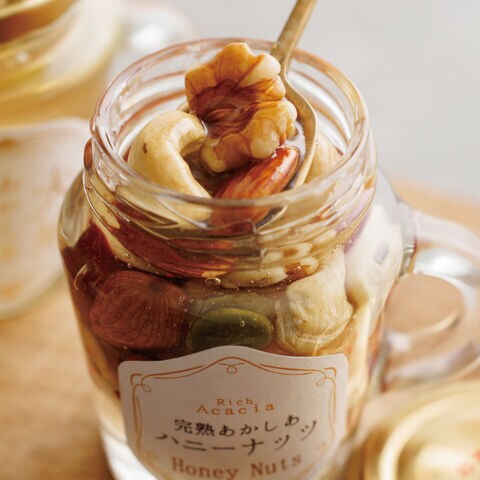 <完熟あかしあハニーナッツ>はちみつ(中国)、ナッツミックス(アーモンド、カシューナッツ、クルミ、かぼちゃの種、ココナッツ、砂糖)、ドライフルーツ(クランベリー、砂糖、植物油)/保存料(亜硫酸塩)