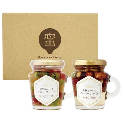 石川県金沢市の金澤やまぎし養蜂場がお届けする「完熟あかしあ ハニーフルーツ ハニーナッツ 詰め合わせ」です。完熟アカシアはちみつを使用したハニーフルーツ、ハニーナッツをセットにしました。