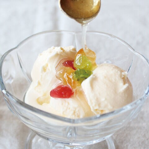 <ハニーフルーツ>養蜂場こだわりのはちみつに、色鮮やかなドライフルーツを漬け込んだ、見た目も楽しめるフルーツ漬け。アイスクリームにトッピングしたり、紅茶に入れてフルーツティー風のドリンクを楽しむのもおすすめです。