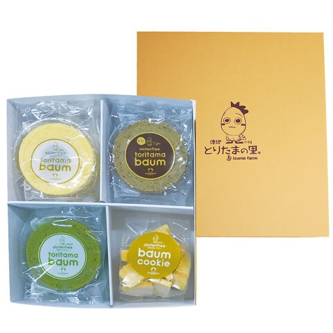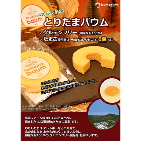 山口県のたまご農家の出雲ファームで採れた卵を主原料にたっぷりと使用した「徳地とりたまの里 グルテンフリー バウム クッキー セット」です。「徳地とりたまの里」は、出雲ファームが営む卵かけご飯専門店。農場で採れた卵と国産の米粉を原料に使用した、グルテンフリーのバウムクーヘン(プレーン・抹茶・コーヒー)とクッキー(プレーン)の詰め合わせです。とりたまバウム(バウムクーヘン)は米粉で作ったとは思えない程しっとりとした食感に仕上がっています。焼き上げたバウムクーヘンを一口サイズにカットし、再度焼きあげたクッキーはサクサク食感が特徴です。小麦粉不使用なので、小麦アレルギーの方やグルテンを控えたい方にもお召し上がりいただけます。おやつ、お茶請け、お茶菓子などとして、お取り寄せでお楽しみください。化粧箱に入れてお届けしますので、贈答やギフトなどにもご活用ください。