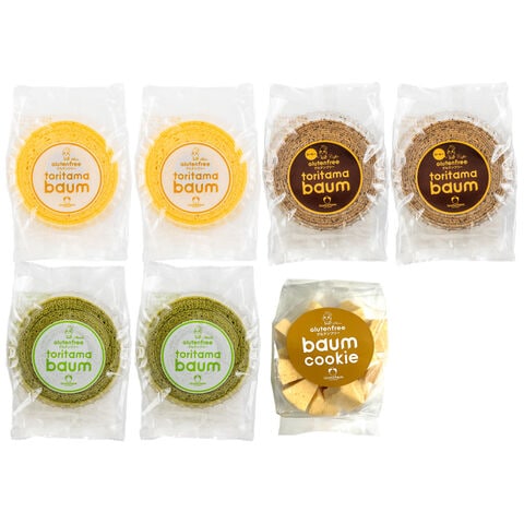 【数量・内容】とりたまバウム(プレーン、抹茶、コーヒー) 各65g×2、バウムクッキープレーン100g×1