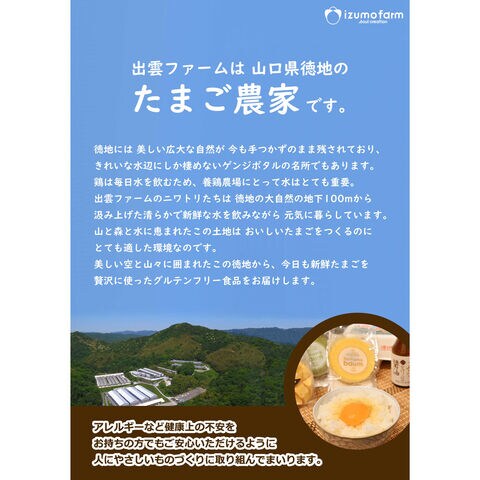 山口県のたまご農家の出雲ファームで採れた卵を使用した「徳地とりたまの里 ピュアプリン」です。「徳地とりたまの里」は、出雲ファームが営む卵かけご飯専門店。農場で採れた卵を割らずにまるごと使った不思議なプリンです。原材料は卵100%です。卵を半分に割って、別添えのカラメルソースをかけてお召し上がりください。デザート、おやつ、ご褒美スイーツなどとして、お取り寄せでお楽しみください。化粧箱に入れてお届けしますので、贈答やギフトなどにもご活用ください。
