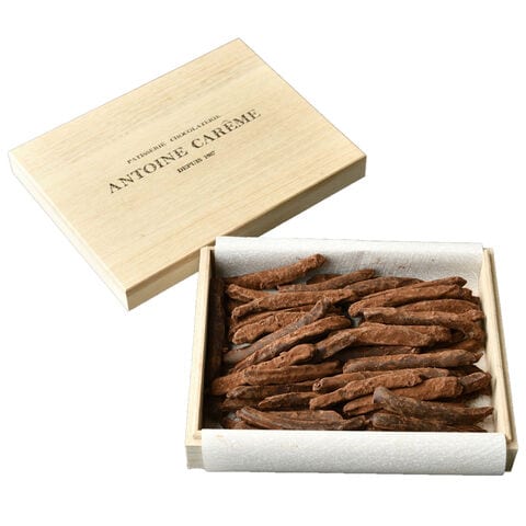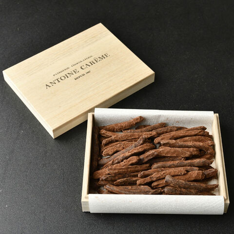「アントワーヌ・カレーム オランジェット チョコレート ギフト」は、東京・目黒のフランス菓子店”アントワーヌ・カレーム”のスペシャリテです。オレンジの皮を10日間シロップで煮、ゆっくりと糖分をしみ込ませ、透明感のあるオレンジコンフィを作り上げます。こうして出来上がったオレンジの皮のコンフィをスティック状に切り、1本ずつチョコレートコーティングし、ココアをまぶした、自慢のショコラです。茶菓子、お茶請け、おやつ、ご褒美スイーツなどとして、お取り寄せでお楽しみください。