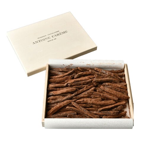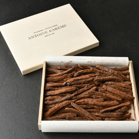 「アントワーヌ・カレーム オランジェット チョコレート ギフト」は、東京・目黒のフランス菓子店”アントワーヌ・カレーム”のスペシャリテです。オレンジの皮を10日間シロップで煮、ゆっくりと糖分をしみ込ませ、透明感のあるオレンジコンフィを作り上げます。こうして出来上がったオレンジの皮のコンフィをスティック状に切り、1本ずつチョコレートコーティングし、ココアをまぶした、自慢のショコラです。茶菓子、お茶請け、おやつ、ご褒美スイーツなどとして、お取り寄せでお楽しみください。