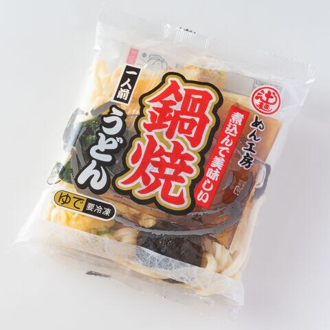 「めん工房辻麺 鍋焼きうどん」は、えび天、つくね、お餅等8種類の具材をセットにした贅沢な一品です。熟成させた、煮込むほどおいしいうどんをぜひご賞味ください。めん、濃縮スープ、具材(もち、つくね、えび天ぷら、玉子焼き、味付きしいたけ、ほうれん草、ねぎ、かまぼこ)が一式そろった便利なセットです。冷凍でお届けしますので、鍋で調理してお召し上がりください。自然解凍はしないでください。
