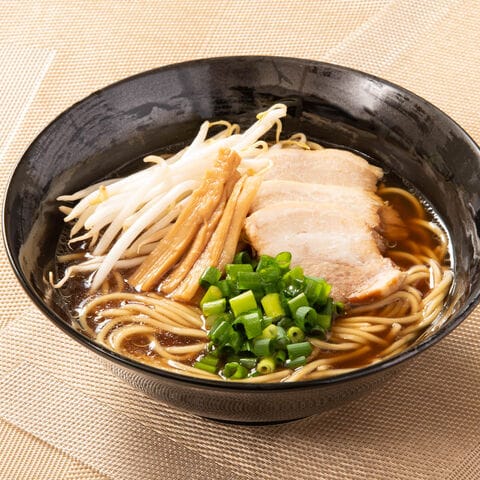 【原材料】めん(小麦粉(国内製造)、でん粉、卵白、食塩/かんすい、クチナシ色素)、具材(焼豚、もやし、味付メンマ、ねぎ/調味料(アミノ酸等)、酸味料)、スープ(しょうゆ、なたね油、ポークエキス、食塩、チキンエキス、砂糖、ビーフ風味調味料、豚脂、メンマ粉末、香辛料/調味料(アミノ酸等)、カラメル色素、加工でんぷん、増粘剤(キサンタン)、香料)、(一部に小麦・卵・牛肉・大豆・鶏肉・豚肉を含む)