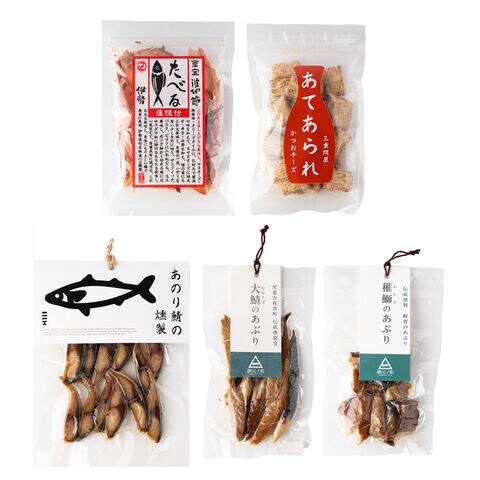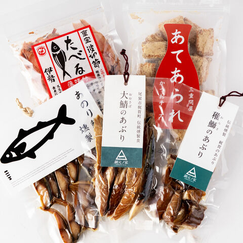 【数量・内容】あてあられ(かつおチーズ)50g、たべるかつお節45g、あのり鯖の燻製50g、梶賀のあぶり(大鯖)60g、梶賀のあぶり(稚鰤)60g