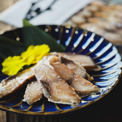 <梶賀のあぶり(大鯖・稚鰤)>直火でじっくり炙った魚の旨味と燻製の香りを楽しめる漁師町伝統の郷土食。塩のみのシンプルな味付けなので、出汁茶漬けにもおすすめ。