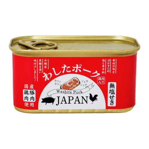 「わした ランチョンミート 缶詰 わしたポーク JAPAN」は、沖縄県を代表する郷土料理”ちゃんぷるー料理”には欠かせない国産豚の「ポークランチョンミート」です。素材の味を活かすため、塩と香辛料、沖縄産黒糖を使い味付けし、さらに食べやすくあっさりとした味わいにするために国産鶏肉も加えました。化学調味料や食品添加物は使用していません。着色剤・発色剤不使用の無塩せきのランチョンミートです。