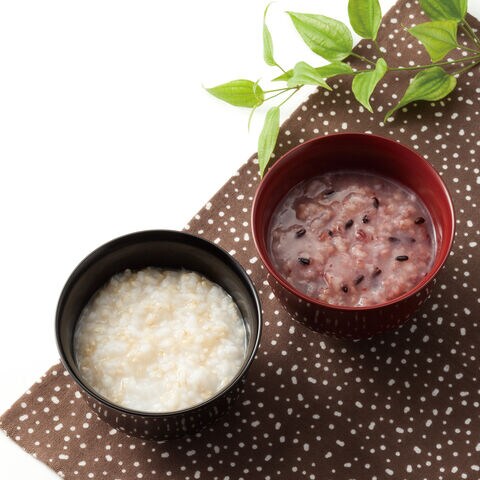 <黒米がゆ>新潟県魚沼産コシヒカリの五分づき精米と黒米を組合せました。五分づき精米は胚芽も残り玄米より食べやすく、そこへ栄養価の高い黒米をプラスしました。