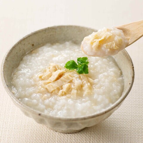 <白だし香る 湯葉がゆ>新潟県岩船産コシヒカリ100%のお米に、湯葉の名産地で知られる栃木県日光の湯葉を使い、白だしをベースに味付けをした贅沢でおいしい湯葉がゆです。