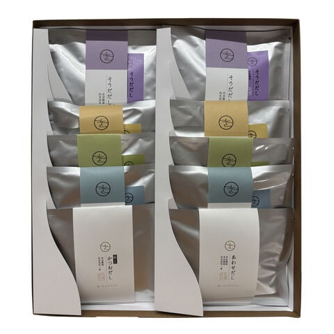 「mizunoto 天然だしパック ギフトセット」は、昭和21年(1946年)創業の老舗だし会社が作った、高級天然だしパックのセットです。だしソムリエ認定講師が厳選した素材を使用。高級な素材を中厚削りにし、旨味、風味をそのままにだしパックに詰めました。品質を保つ為、1パックずつアルミパックに完全個別包装。時間が経っても変わらぬ削りたての旨味・風味をお届けします。調味料・加工助剤など添加物は一切不使用です。また、だしパックの袋にもこだわり、お湯の中で削り節が対流できる大きさを研究。無漂白の袋を採用しています。熟練の卓越したかつお節削りの技術で、節の繊維を傷つけぬよう、丁寧に真心こめて、製造しています。厳選素材を使用した風味の良いおだしをどうぞお召し上がりください。上品な高級おだしなので、ギフトや贈答品として、お歳暮や引き出物などに自信を持って贈る事が出来ます。