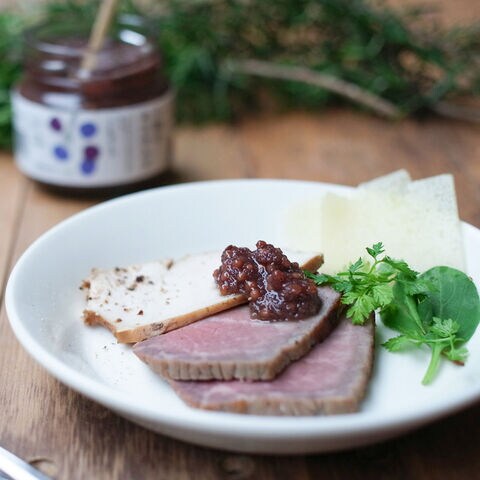 <十勝のモスタルダ>フルーツの自然な甘みと粒マスタードの酸味とのハーモニーを楽しめます。ローストビーフやハードチーズなどに添えるのがおすすめです。冷製パスタのソースにもどうぞ。