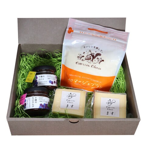 【数量・内容】ます100g×2、フロマージュブラン300g×1、十勝のモスタルダ90g×1、十勝のコニャ90g×1