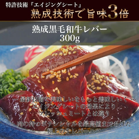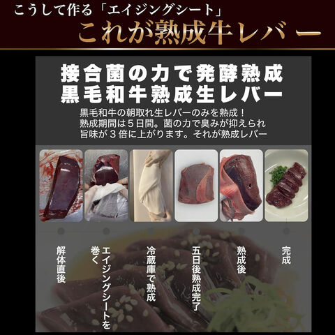 ”エイジングシート”という明治大学と共同開発した新しい発酵技術で作られた「旬熟成 熟成牛 生レバー」です。素材に、国産黒毛和牛のレバーを使用。その日採れたての牛レバーを入手し、鮮度の良い状態でエイジングシートをまいて5日間の熟成を施すと、発酵菌により酸化が抑えられ、牛レバー特有の内臓臭がかなり軽減されます。エイジングシートにより全く臭みのない牛レバーに仕上がり、冷凍しても鮮度の良い状態で保存されます。発酵菌は安全性試験をクリアし、人体無害の裏付けをとっており、定期的に食品検査も実施しています。