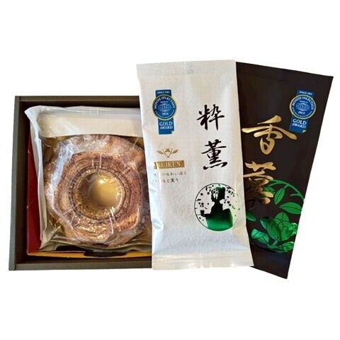 静岡県藤枝市のバームクーヘン専門店”Baum薫~ばあむくん~”がお届けする「Baum薫 バームクーヘン ハード 煎茶2種 ギフトセット」です。日本ギフト大賞2023「静岡賞」を受賞したバームクーヘン『ハード』、香り・甘味・旨味を追求した、モンドセレクション2024金賞受賞茶『香薫(こうくん)』『粋薫(すいくん)』をセットにしました。