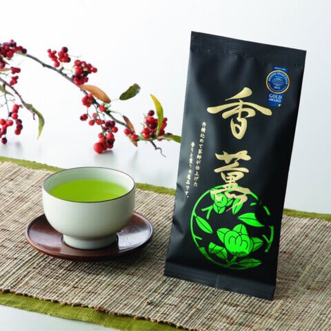 <香薫>香ばしい香りと甘味のある味・鮮やかな水色が特徴。遠赤外線焙煎機械で香ばしく仕上げたお茶を使用し、更に甘味と水色の良い茶葉をブレンドしています。