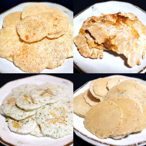 【原材料】馬鈴薯粉(北海道製造)、松葉蟹(京丹後市又は兵庫県産)、甘海老(兵庫県産)、飛魚(京丹後市産)、ちりめんじゃこ(国産)、あおさ粉、塩、砂糖、しょうゆ、みりん、(一部に小麦・大豆・かに・えびを含む)