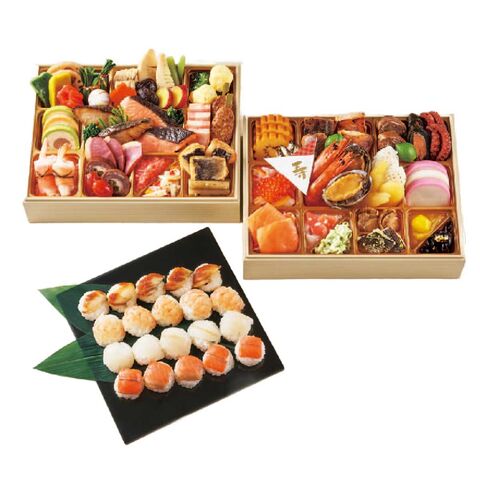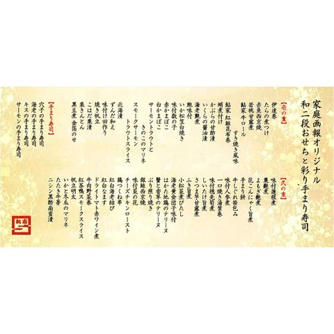【原材料】穴子手毬寿司(国内製造)、サーモン手毬寿司(国内製造)、海老手毬寿司(国内製造)、キス手毬寿司(国内製造)、伊達巻、銀鮭西京焼、ぶり照り焼き、かぶらの甘酢漬、赤魚西京焼、海老艶煮、栗きんとん、はかた地どりのテリーヌ、蟹と香草のテリーヌ、チーズチキンロースト、ニシン黒酢南蛮漬、牛ロールすき焼き風味、味付菜の花、鶏つくね串、サーモントラウトときのこのマリネ、牛肉野菜巻、紅鮭昆布巻、えび黄金団子味付、北海漬、ずんだ和え、焼き湯葉巻、味付数の子、蛸煮付け、鮑味付、いか松笠白焼き、小松菜煮びたし、紅白なます、黒豆煮金箔のせ、帆立明太、いかと冬瓜のマリネ、たらの煮付け、紅茶鴨スモークスライス、スモークサーモントラウトスライス、さつま芋甘露煮、紅白海老結び、焼き帆立、たたき牛蒡、味付穂先筍煮、しいたけ旨煮、若桃甘露煮、味付蓮根煮、牛しぐれ笹包み、ドライトマト赤ワイン煮、赤かまぼこ、白かまぼこ、こはだ粟漬、てまり餅、味付人参煮、いくら醤油漬、粟麩煮、よもぎ麩煮、花こんにゃく旨煮、ふき旨煮、味付田作り、調味料(アミノ酸等)、酸味料、pH調整剤、香料、糊料 (増粘多糖類、加工澱粉)、酸化防止剤(V.C、亜硫酸塩、チャ抽出物)、加工澱粉、乳化剤、グリシン、ソルビトール、酒精、トレハロース、甘味料(カンゾウ、ステビア)、着色料(カロチノイド、クチナシ、ウコン、カラメル、紅麹、キビ色素、ラック、黄4、黄1、青1、コチニール、アカキャベツ、アカダイコン、スピルリナ青、金)、リン酸塩(Na、K)、酵素、酢酸Na、香辛料抽出物、保存料(ソルビン酸、ソルビン酸K、ポリリジン)、漂白剤(亜硫酸塩)、カイワレ抽出液、発色剤(亜硝酸Na)、カゼインNa、セルロース、クエン酸、ビタミンB1、乳酸Ca、水酸化Ca、(一部に乳成分・小麦・卵・えび・かに・あわび・いか・いくら・牛肉・ごま・さけ・さば・大豆・鶏肉・ 豚肉・もも・りんご・ゼラチン・魚醤(魚介類))
