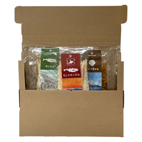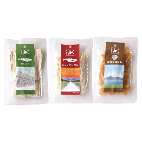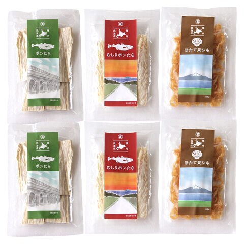 【数量・内容】ポンたら28g、ほたて貝ひも36g、むしりポンたら20g 各2