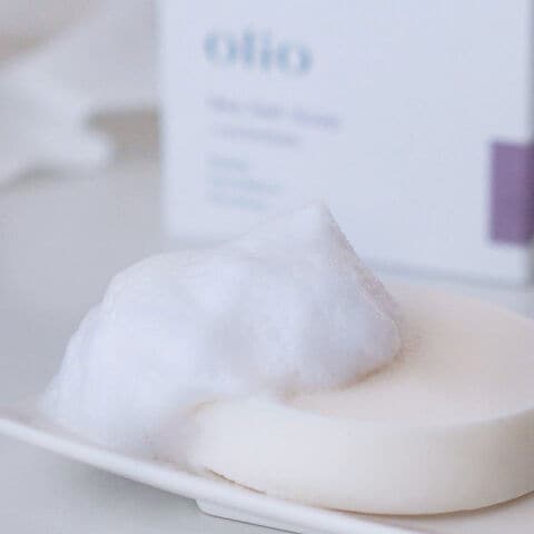 「olio 塩石けん ラベンダー 泡立てネット付」は、植物性の石けん素地と瀬戸内海の海塩を使用した、自然由来成分100%の無添加石けんです。防腐剤・合成香料・界面活性剤などの添加物は不使用。肌への刺激が少なく、敏感肌の方や生まれたばかりの赤ちゃんの肌にもお使いいただけます。豊富なミネラルを含んだ、瀬戸内海の海塩をたっぷり配合。天然塩の力で肌にうるおいを与えます。生理食塩水と同じ濃度の泡は目や傷にもほとんどしみません。真空加圧製法により、水や熱を加えず一つひとつ丁寧に作られています。湿気の多い浴室でも泡が溶けにくく、長持ちします。付属の泡立てネットで、もっちり濃密泡が簡単に作れます。アロマテラピーアドバイザーが厳選した、ラベンダー精油を使用。合成香料を使わず、心をほぐすようなやさしい香りが広がります。肌のキメを整え、うるおいを与えたい方などにおすすめです。