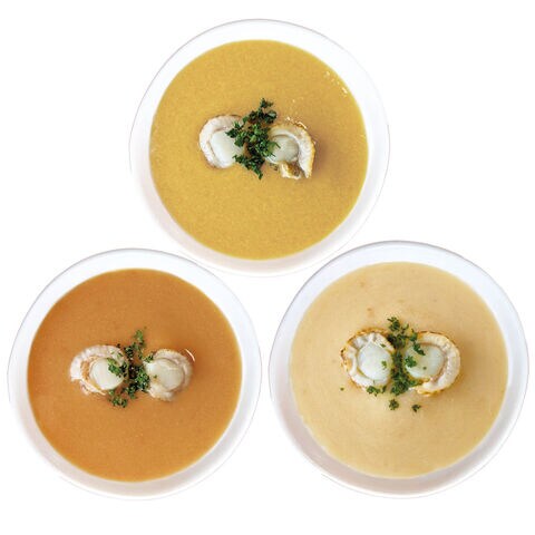 <かぼちゃ>かぼちゃ(青森県産)、ホタテ、全粉乳、オニオンソテー、砂糖、貝柱だし、玄米粉、バター、食塩、にんにく/増粘多糖類、加工デンプン、(一部に乳成分・小麦・大豆を含む)