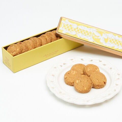 【原材料】<クレムアンバー(アンバーサブレ)>小麦粉(国内製造)、食塩不使用バター、黒糖、くるみ、海塩/カラメル色素、香料、(一部に小麦・乳成分・くるみを含む)