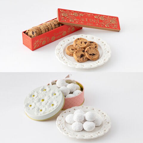 【数量・内容】メルシーサブレ(サブレショコラ)×12枚入、フラワースノーボール(プレーンスノーボール)×12粒入、ハミングスノーボール(メイプルスノーボール)×12粒入