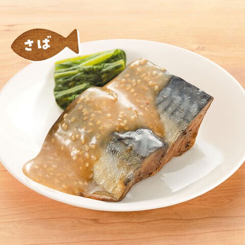 <さばゴマ味噌煮>さば(国産)、みそ(大豆を含む)、甜菜含蜜糖、本みりん、ごま、米粉、塩麹、上白糖