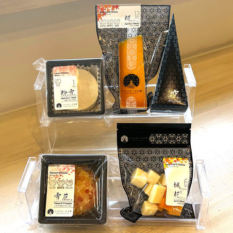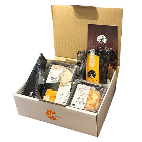 【数量・内容】ブルーチーズニ世古 空100g、デザートチーズ二世古 雪花(パパイヤ&パイナップル)150g、セミハードチーズ二世古 椛(12ヶ月)100g、セミハードチーズ二世古 楓×椛(クラッシュ)70g、二世古チーズ 粉雪(短熟)90g