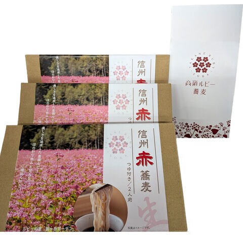 原料に”高嶺(たかね)ルビー”の蕎麦粉を使用した「 信州赤蕎麦 ギフト」です。高嶺ルビーはピンクから赤色の花を咲かせる珍しいソバの品種。高嶺ルビーのルーツは、標高3,800mのヒマラヤの麓に咲いていた、名もなき『赤いソバ』です。その原種をもとに、タカノ株式会社と信州大学が何年にも渡る研究と改良の末、日本の風土に合う、貴重な品種「高嶺ルビー2011」にたどり着きました。花の色が宝石のルビーに似た、美しい高嶺ルビーが咲き誇る光景は、赤い絨毯のようで壮観です。