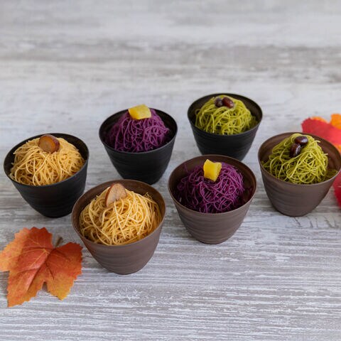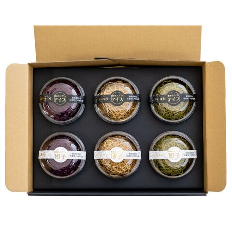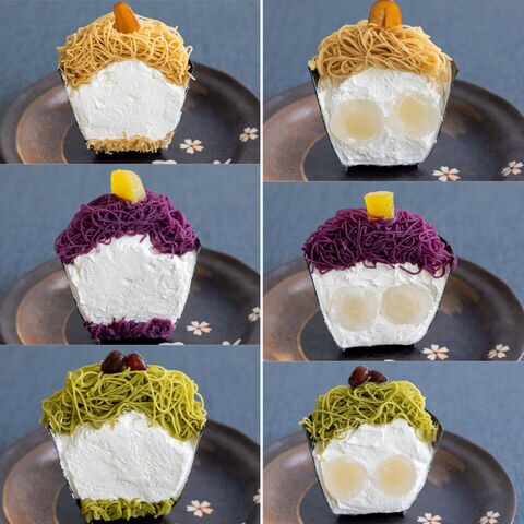 【数量・内容】絹糸モンブラン団子(高級和栗(桜)77g、贅沢抹茶(桜)74g、逸品紫芋(桜)77g)、絹糸モンブランアイス(高級和栗(桜)85ml、贅沢抹茶(桜)81ml、逸品紫芋(桜)85ml)