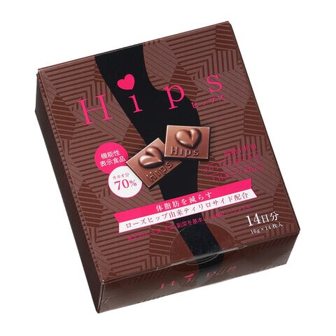 「Hips 機能性表示食品 チョコレート ギフト」は、BMIが高めの方の体脂肪を減らす効果が認められている、ローズヒップ由来ティリロサイド配合のカカオ70パーセントチョコレートです。コロンビア産の高級カカオを使用。砂糖不使用で仕上げた、香り豊かですっきりとした味わいの高カカオチョコレートです。