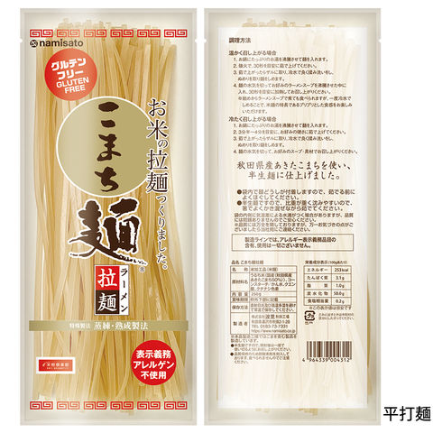 蒸気で米粉を練り上げる蒸練製法で、餅のようなコシの強さと半生麺で常温1年という長い日持ちを実現しました。あきたこまちの持つ独特の粘りと甘味・旨味、そしてモチモチ感が特徴です。