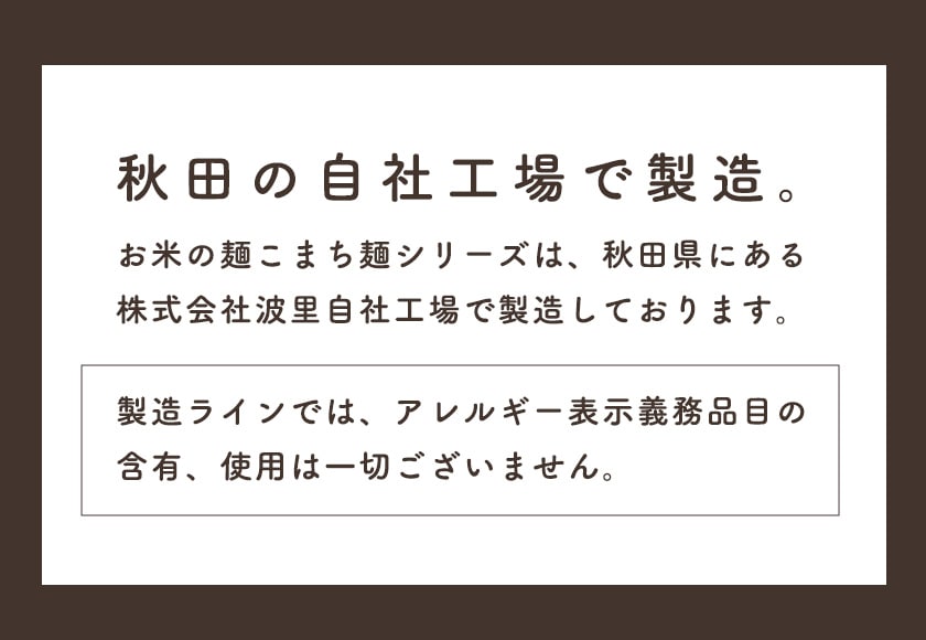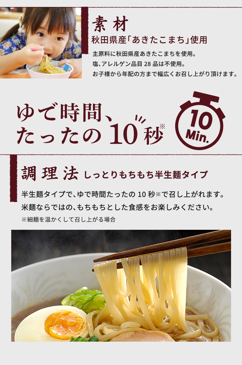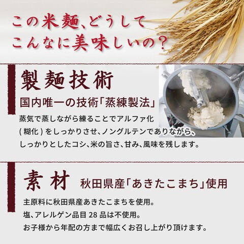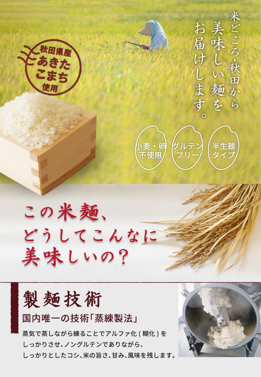蒸気で米粉を練り上げる蒸練製法で、餅のようなコシの強さと半生麺で常温1年という長い日持ちを実現しました。あきたこまちの持つ独特の粘りと甘味・旨味、そしてモチモチ感が特徴です。