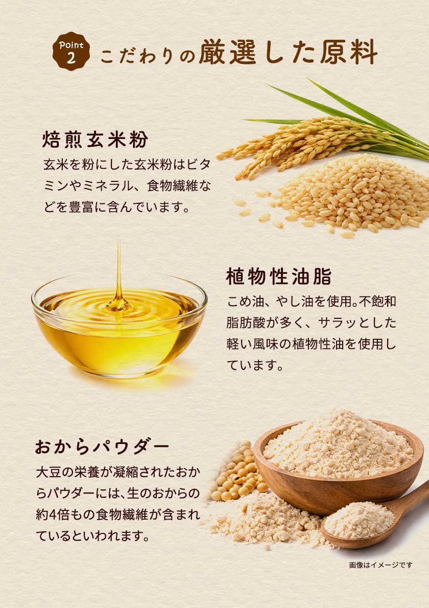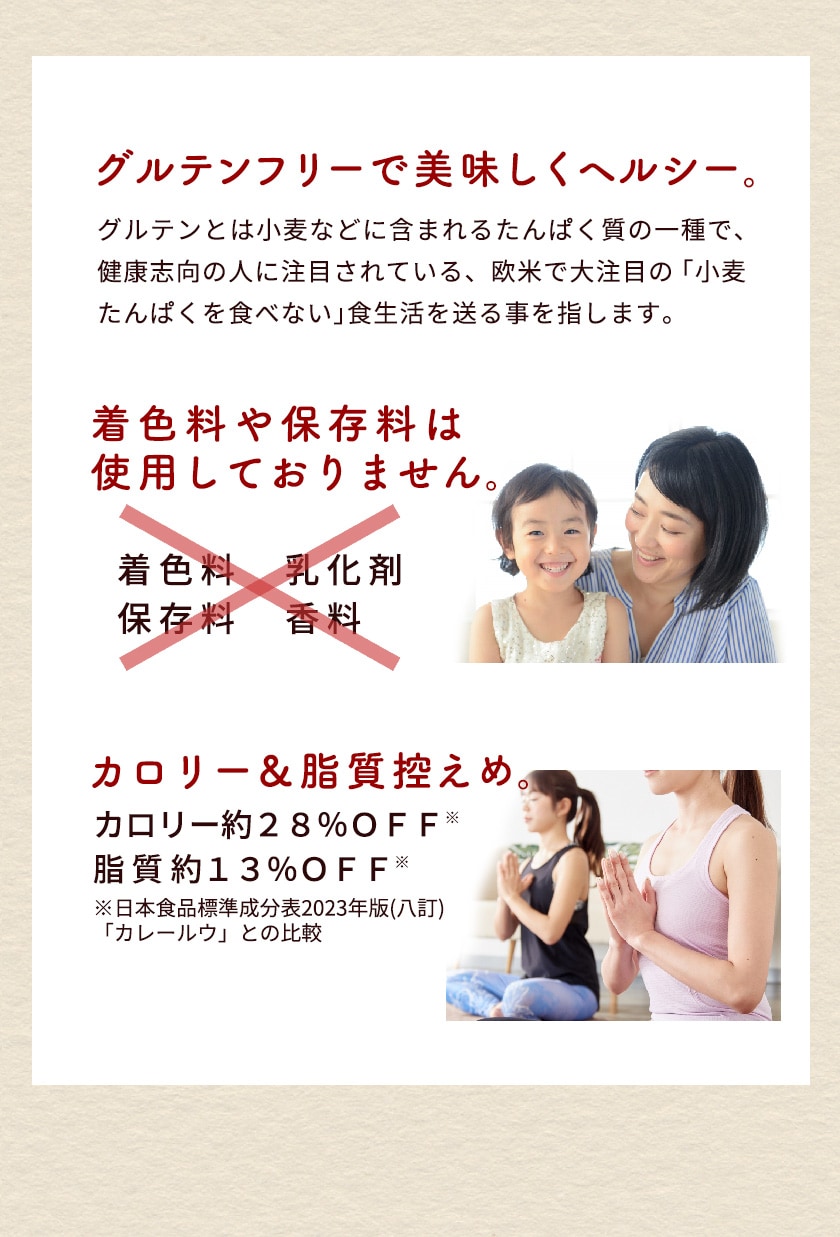 | 原材料名 | 焙煎玄米粉(国産)、米油、食用やし油、トマトペースト、おからパウダー(国産・遺伝子組み換えでない)、天日塩、デーツピューレ、カレー粉、醤油(小麦粉不使用)、ウスターソース、ホワイトソルガム、オニオンパウダー、ガーリックパウダー、香辛料、米粉(国産)、ガラムマサラ(香辛料)、ジンジャーパウダー、昆布パウダー(国産)、ココアパウダー、(一部に大豆を含む) |