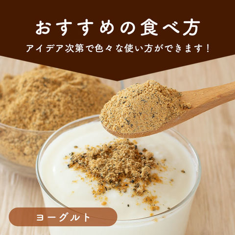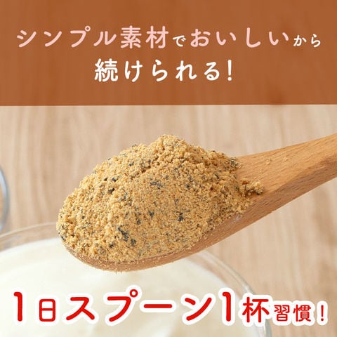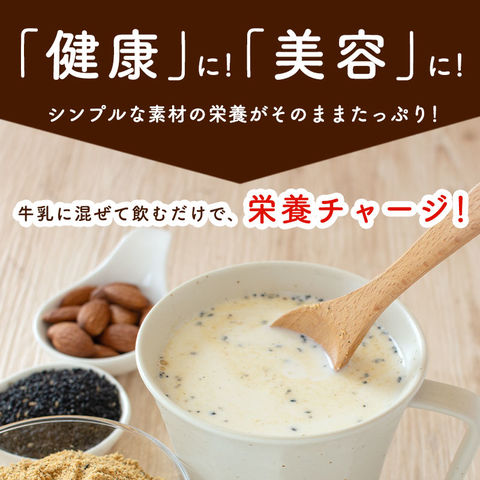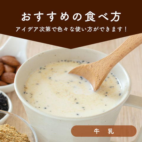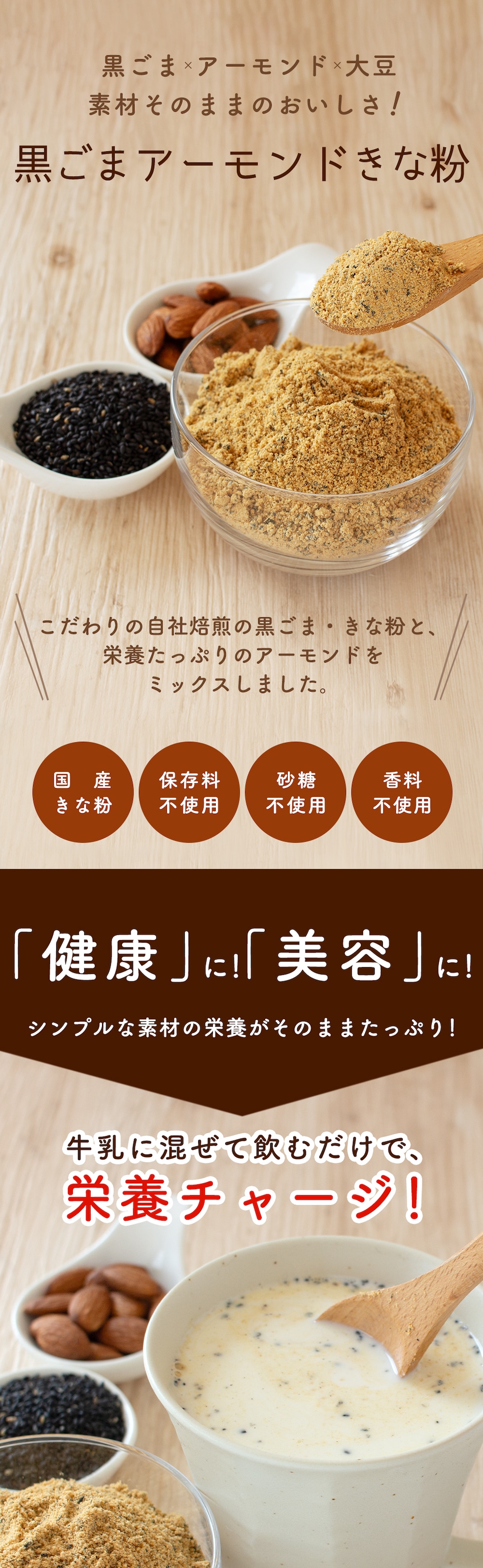 当社人気のきな粉に、黒ごまとアーモンドの香ばしい風味がプラスされ、いつもの牛乳に加えるだけで栄養と満足感をプラスしてくれます。牛乳に混ぜたり、ヨーグルトにかけることはもちろん、砂糖・香料不使用で、お菓子作りやお料理にもご使用いただけます。
