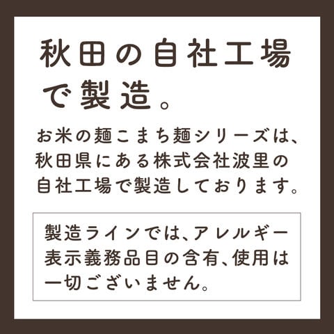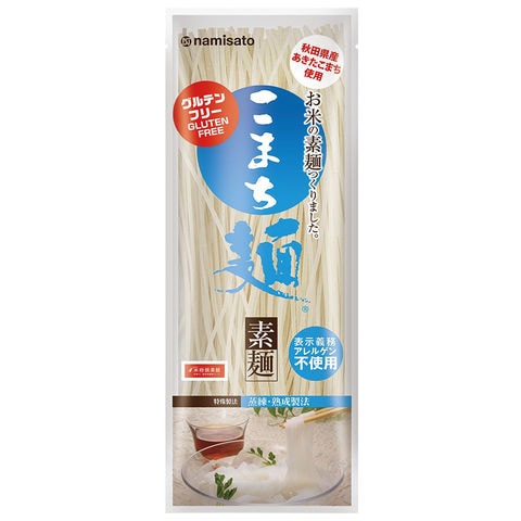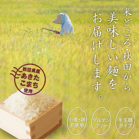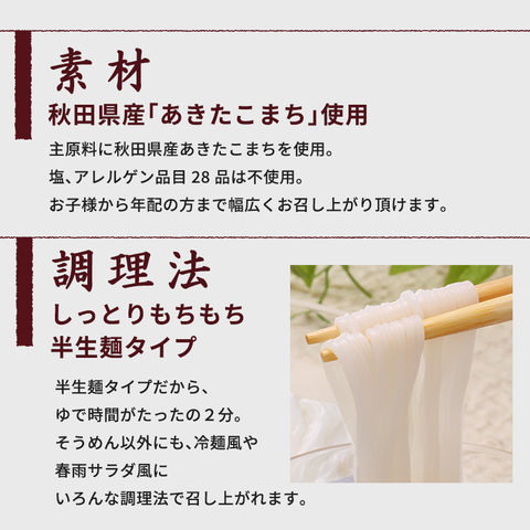 秋田県産あきたこまちを使い、半生麺に仕上げました。蒸練熟成製法により、日持ちが長くコシのしっかりしたこめ麺が完成しました。あきたこまちの持つ独特の粘りと甘味・旨味、そしてモチモチ感が特徴です。 そうめんに最適な細麺に仕上げました。冷麺や春雨サラダなど色々なお料理でお召し上がりください。