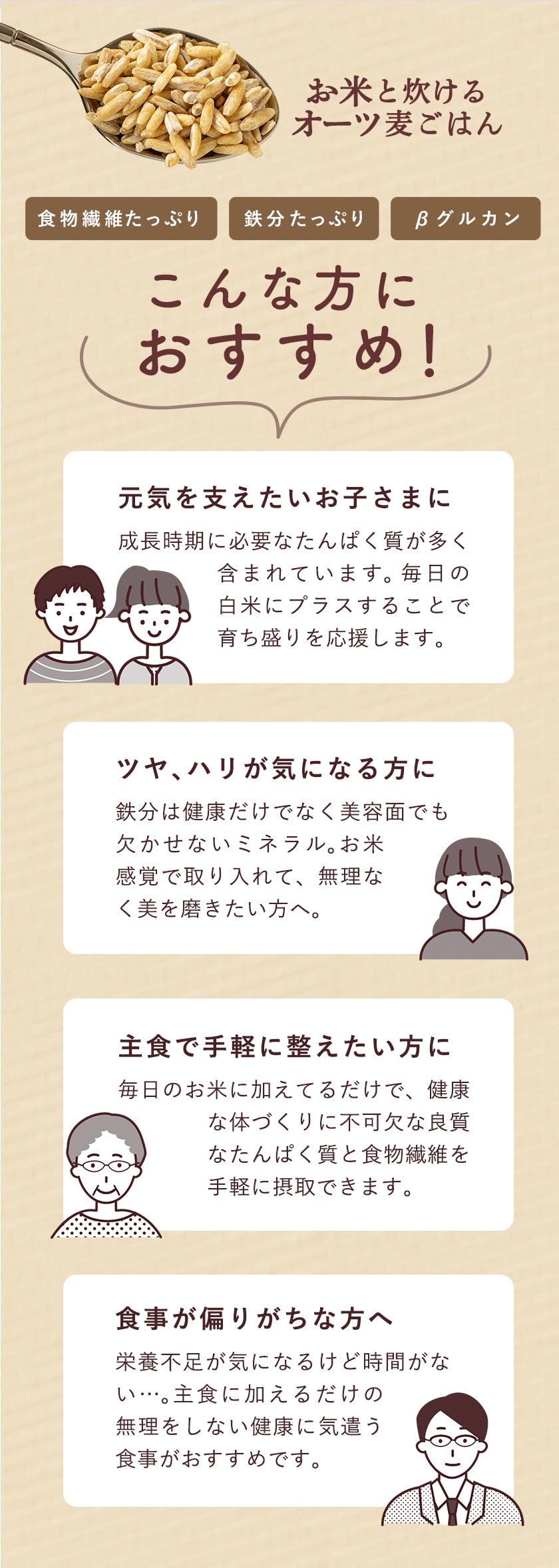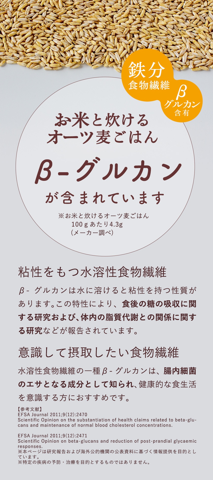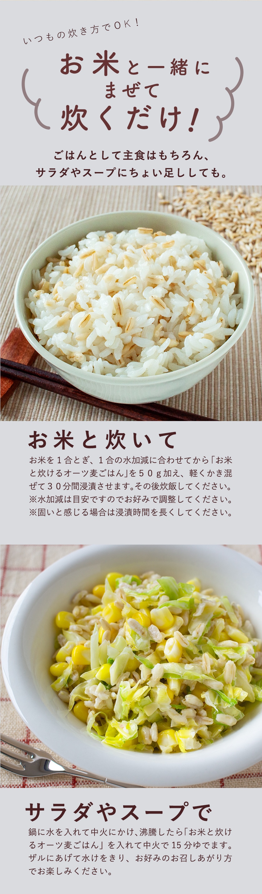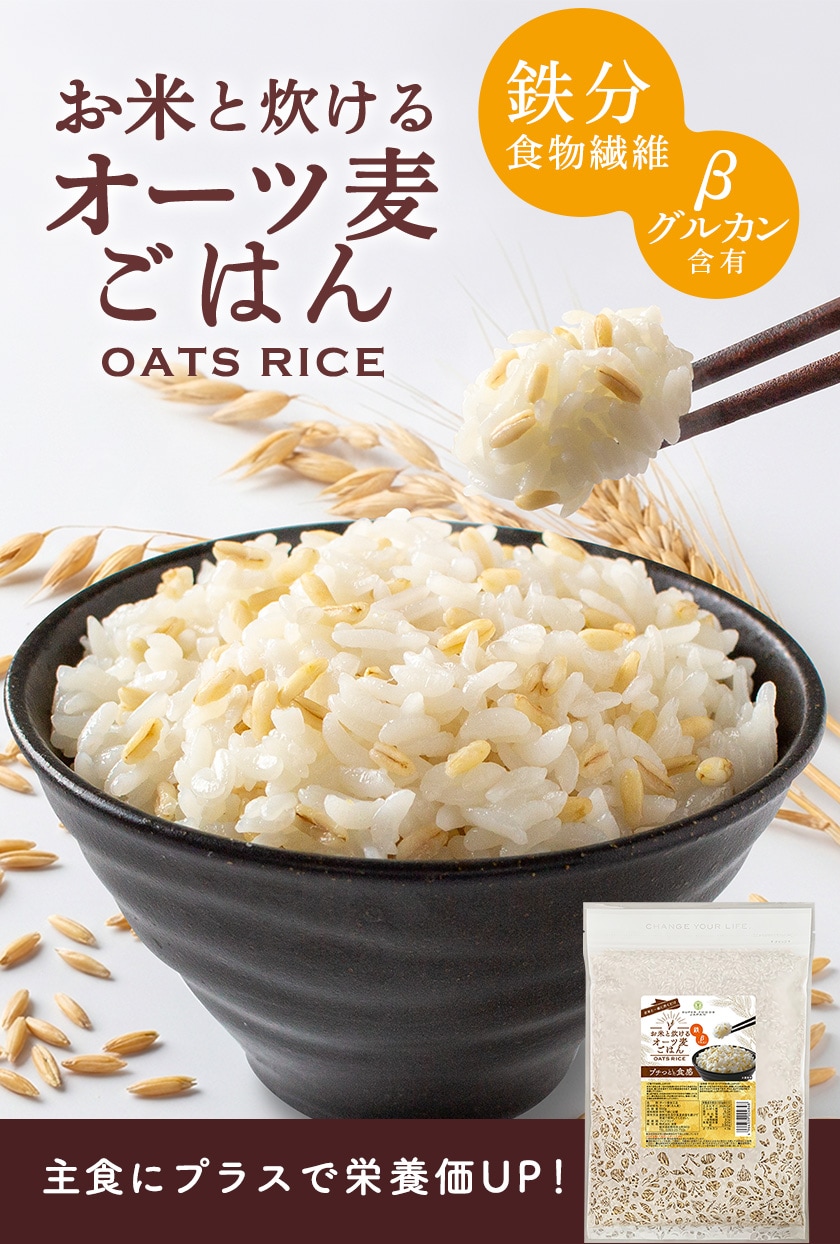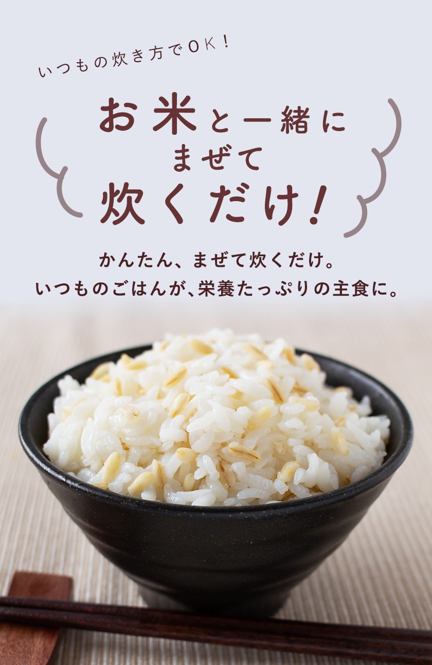 食物繊維、鉄分、たんぱく質が豊富、さらにβ-グルカンが含まれるバランス食のオーツ麦。ごはんと一緒に炊けて、おいしくお召し上がりいただける「お米と炊けるオーツ麦ごはん」。