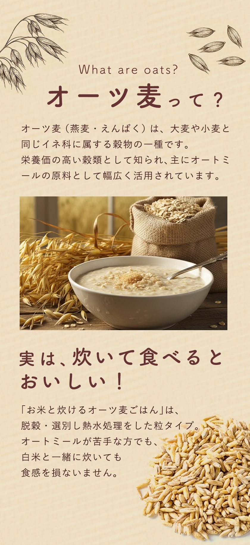 オーツ麦(燕麦・えんばく)は、大麦や小麦と同じイネ科に属する穀物の一種です。栄養価の高い穀類として知られ、主にオートミールの原料として幅広く活用されます。「お米と炊けるオーツ麦ごはん」は、脱穀・選別し熱水処理をした粒タイプ。オートミールが苦手な方でも、白米と一緒に炊いても食感を損なわずおいしくいただけます。
