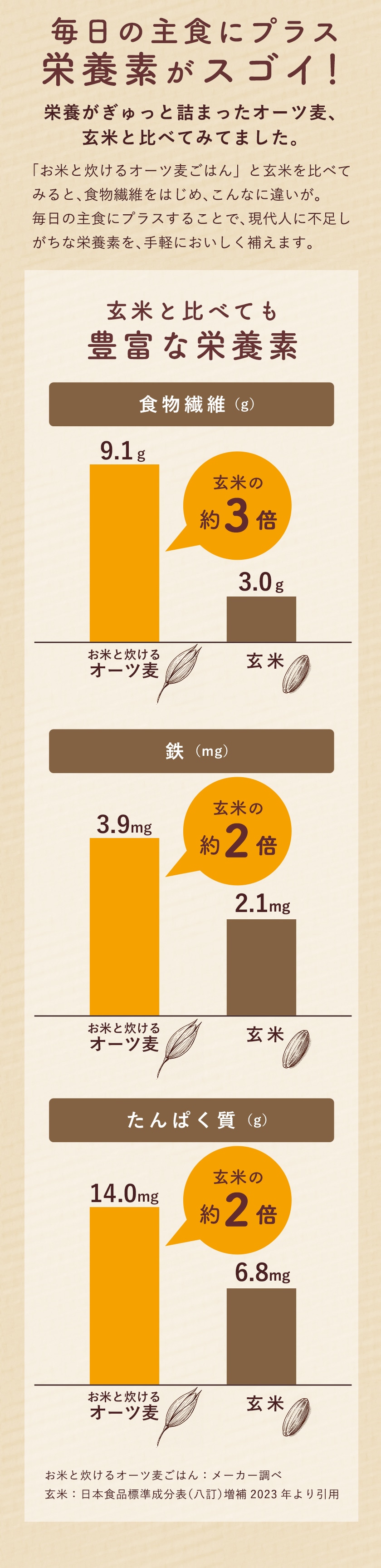毎日の主食にプラスするだけでバランスの摂れた栄養食に。玄米と比較しても、食物繊維は約3倍、鉄は約2倍、たんぱく質が約2倍!(メーカー調べ、玄米は日本食品標準成分表(八訂)増補2023年より引用)