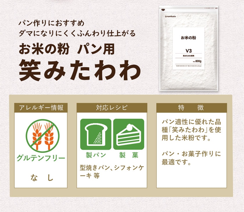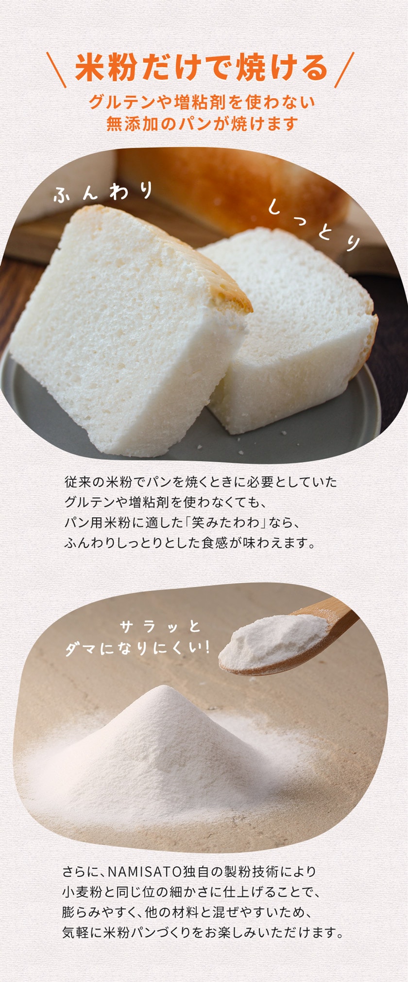 製パン適性が高い品種のミズホチカラの品種改良により誕生した笑みたわわ。波里独自の製粉技術で細かく仕上げました。パン作り用のグルテンフリーの米粉です。