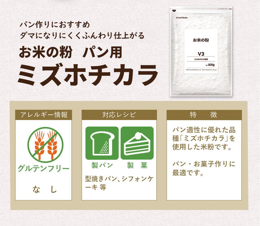製パン適性が高い品種のミズホチカラを独自の製粉技術で細かく仕上げました。パン作り用のグルテンフリーの米粉です。※生地が柔らかいため成形パンには向きませんが小麦グルテン添加でお作りいただけます。