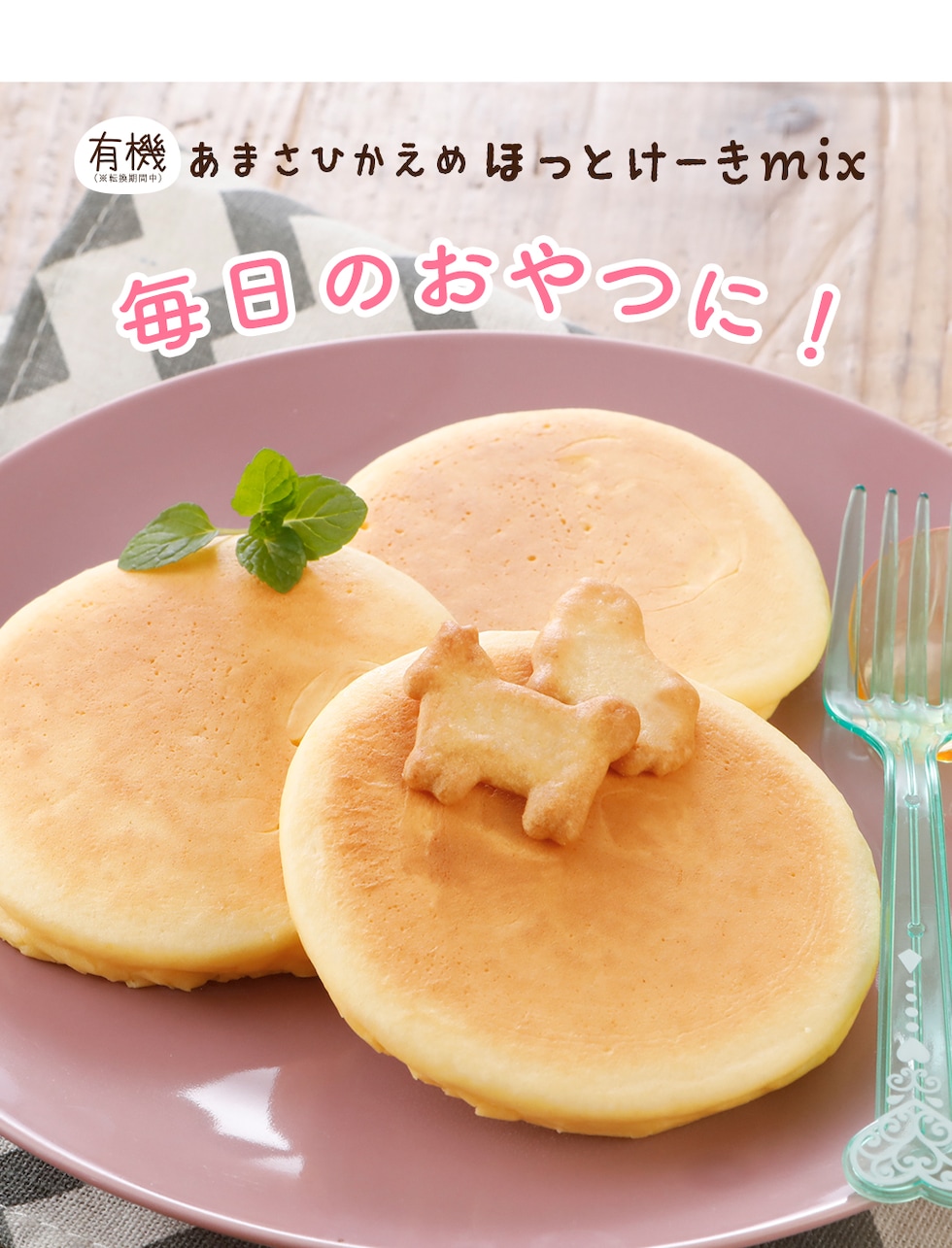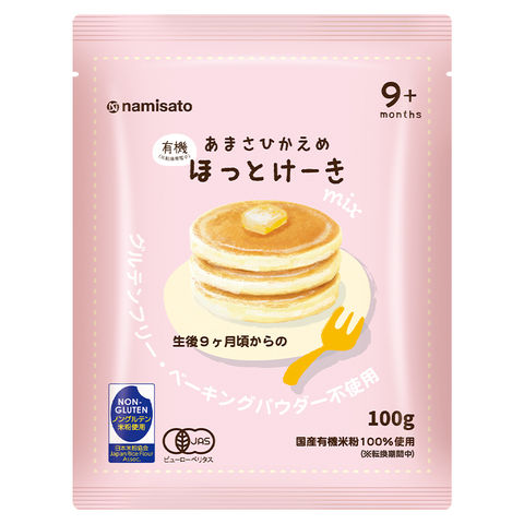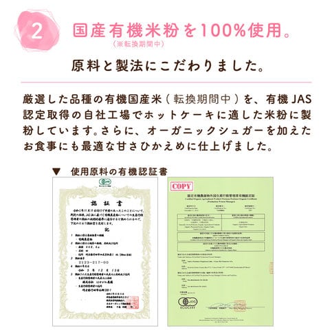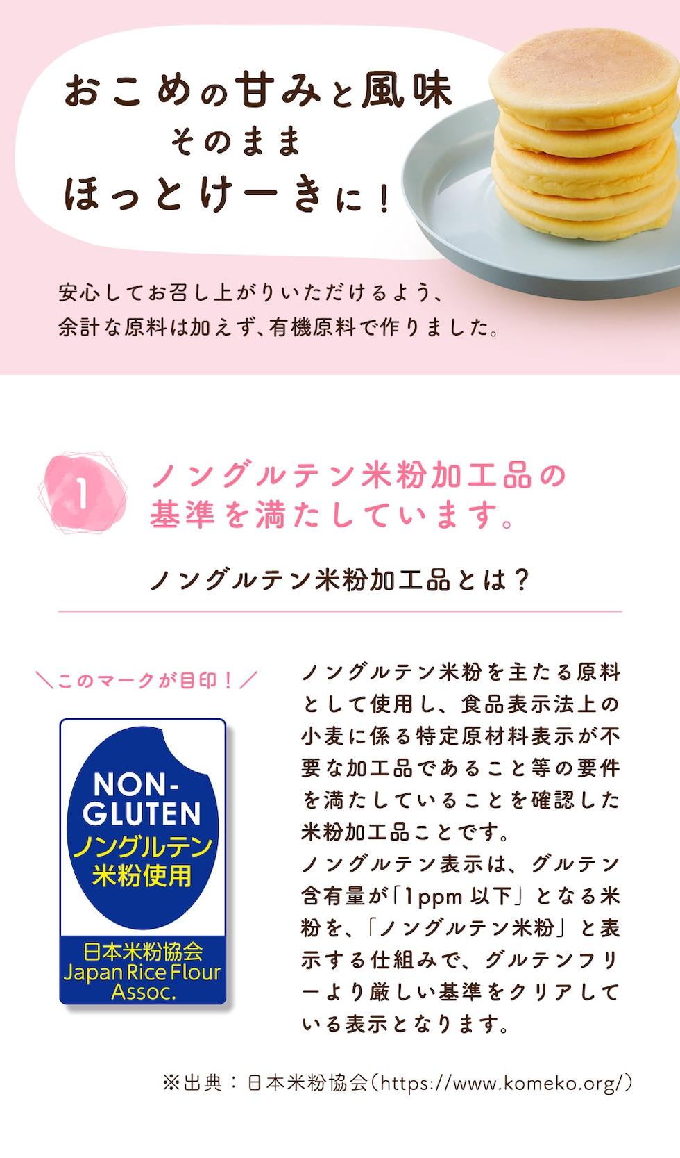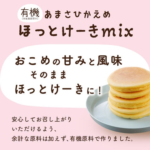国産の有機米粉(※転換期間中)を使った小麦粉不使用・保存料不使用・香料不使用・着色料不使用のからだにやさしいホットケーキミックスです。甘さひかえめでお好みの素材と合わせてアレンジ自在、お野菜などと合わせて、果物などと合わせて、お食事にもどうぞ。有機原料にこだわり、食品添加物を一切使用しておりませんので毎日のおやつ、お食事におすすめです。小麦粉不使用で米粉のもっちり食感をお楽しみ頂けます。 ※本品は乳児用規格適用食品(食品衛生法に基づき、乳児用食品に係る放射性物質の規格が適用される食品)です。 ※「転換期間中有機農産物」は、「有機農産物」と同様に、認証を受けた生産者により有機的管理が行われた農産物です。(栽培方法は認証を受けた有機農産物と同じです)